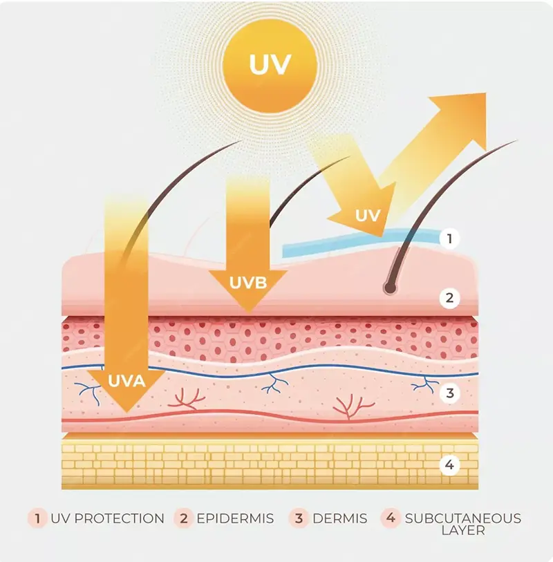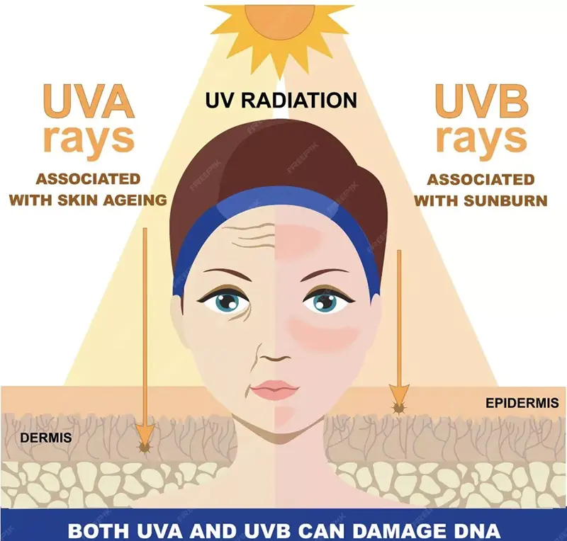 Atât UVA, cât și UVB pot provoca leziuni ale pielii, dar efectele lor sunt diferite în principal datorită adâncimii lor de penetrare. Evident, UVA mai bogate pot pătrunde mai adânc în derm și sunt mai direct legate de fotoîmbătrânire, deoarece vor produce ROS și vor degrada colagenul și elastina, ceea ce va duce la riduri, pierderea elasticității pielii și alte semne de îmbătrânire prematură. În schimb, UVB afectează în principal epiderma, provocând arsuri solare (eritem solar) și producție de melanină pe termen scurt, în timp ce expunerea pe termen lung poate duce la hiperkeratoză și crește semnificativ riscul de tumori maligne ale pielii.