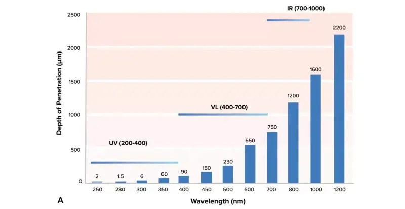 După cum se arată în figura de mai sus, lumina vizibilă are o mare influență asupra pielii, deoarece această bandă are o adâncime de penetrare mai profundă în piele. Lumina roșie poate pătrunde în epidermă și dermă și poate ajunge în stratul de grăsime, indicând relația dintre lungimea de undă și adâncimea de penetrare și relația inversă dintre lungimea de undă și energie, în timp ce lumina albastră are energie mai mare și adâncime de penetrare mai mică decât lumina roșie.