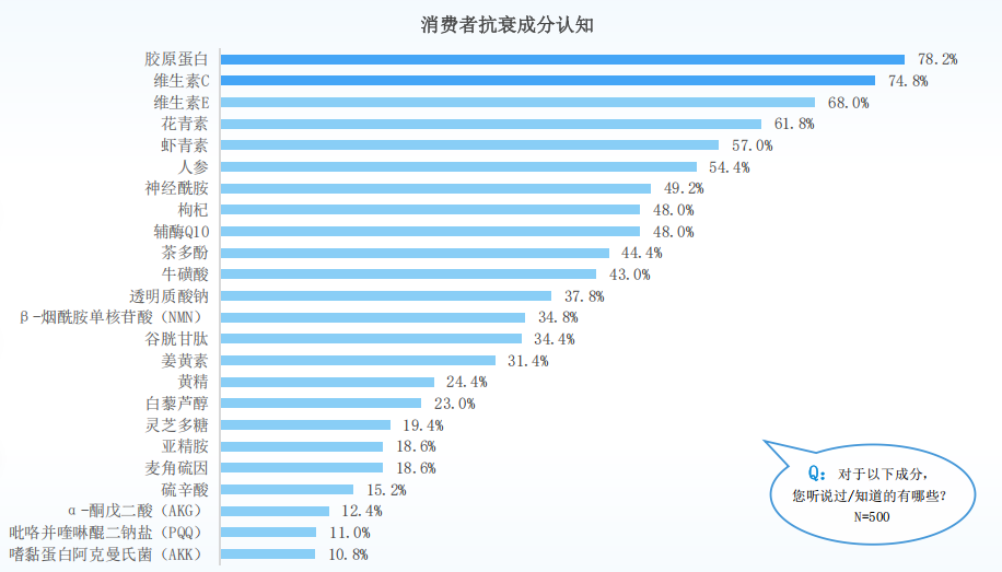 Datorită educației și dezvoltării pieței, colagenul este în prezent un „ingredient anti-îmbătrânire” foarte recunoscut în rândul consumatorilor. În sondajul privind înțelegerea ingredientelor anti-îmbătrânire principale, colagenul (78,2%), vitamina C (74,8%) și vitamina E (68%) sunt primele trei ingrediente pe care consumatorii le recunosc pentru produsele orale anti-îmbătrânire. Printre primele 5 percepții ale ingredientelor anti-îmbătrânire în diferite grupe de vârstă, colagenul este, fără îndoială, „ingredientul vedetă”.